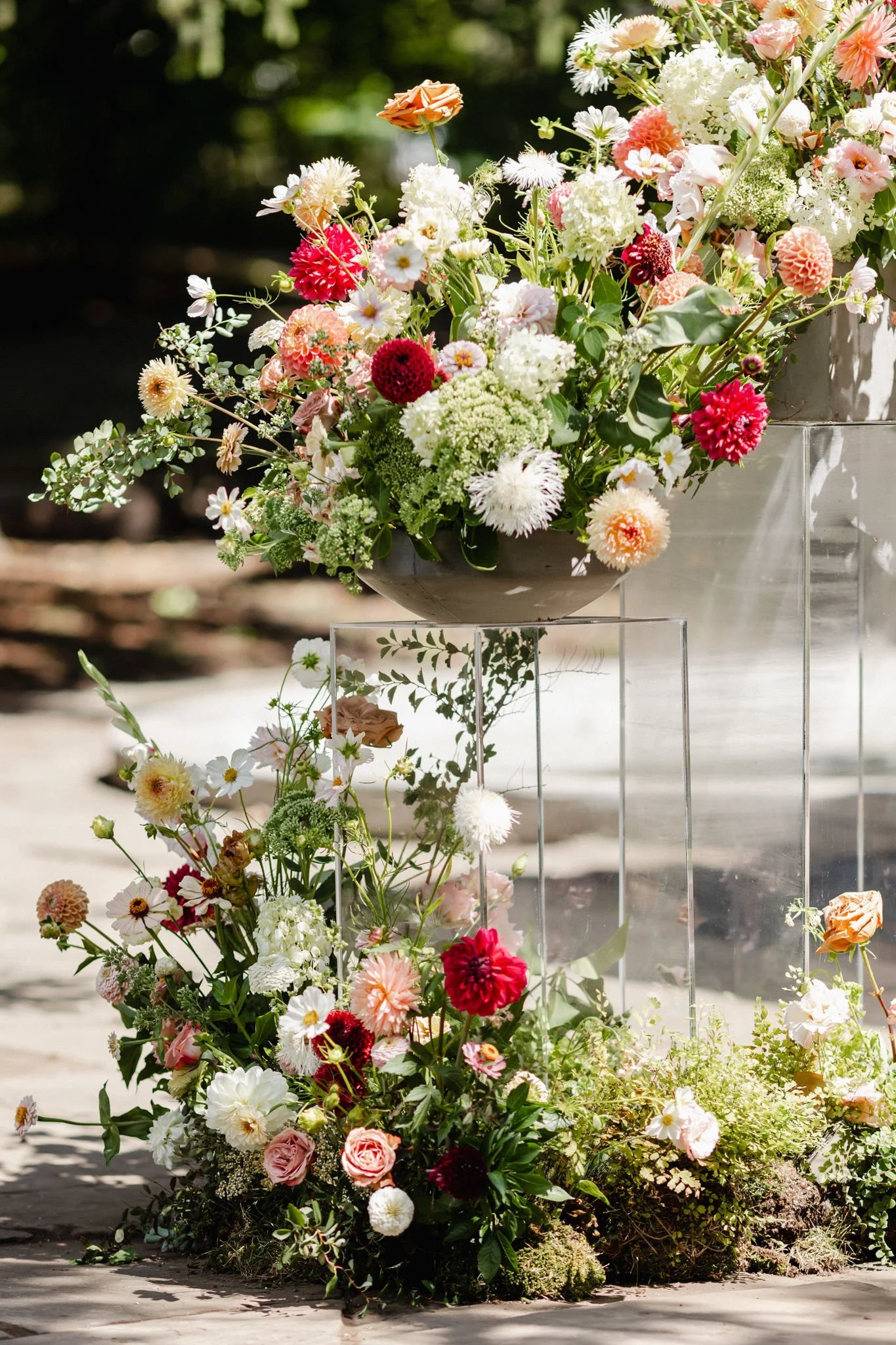 This August wedding radiated romance and elegance! The design brief called for a grand floral installation crafted entirely with sustainable methods. Our lovely couple sought to create a memorable atmosphere, opting out of traditional centerpieces and instead choosing a unique- romantic color palette that broke the mold.